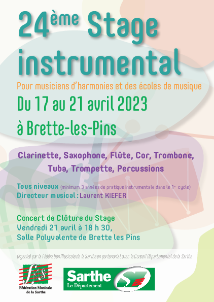 Le stage instrumental de la Fédération Musicale de la Sarthe se déroule habituellement chaque année au lycée de Brette les Pins (72), pendant la première semaine des vacances scolaires de printemps (avril).